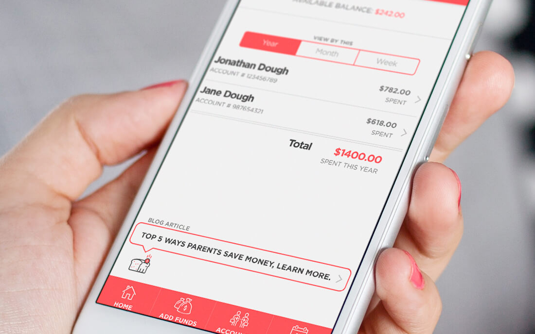 Kids Accounts Notes – each child with information related to each of them account number, how much they have spent, total there if there’s more than one child, you can modify the timeframe: year to date, etc. by taping on the link. There’s also personalize messaging to help parents showing them ways to save message box with ideas. Just like your banking app, you can tap each child to get transactional details.